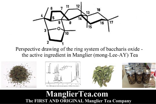 Intrigued by the testimonials and effectiveness of manglier tea for clearing fever, inflammation, cold and flu syptoms - and being an academically trained analytical chemist (Bachelors of Science Degree in Chemistry from Grambling State University in 1991) - I began researching the active ingredients of manglier tea. Using gas chromatoraphy laboratory analysis research, I found the active ingredient to be Baccharis Oxide. Baccharis Oxide is a very powerful triterpenoid which is ahighly multifunctional compound with very strong antiviral capability.The many general traditional medicinal uses of Baccharis include the treatment of bacterial/fungal infections.